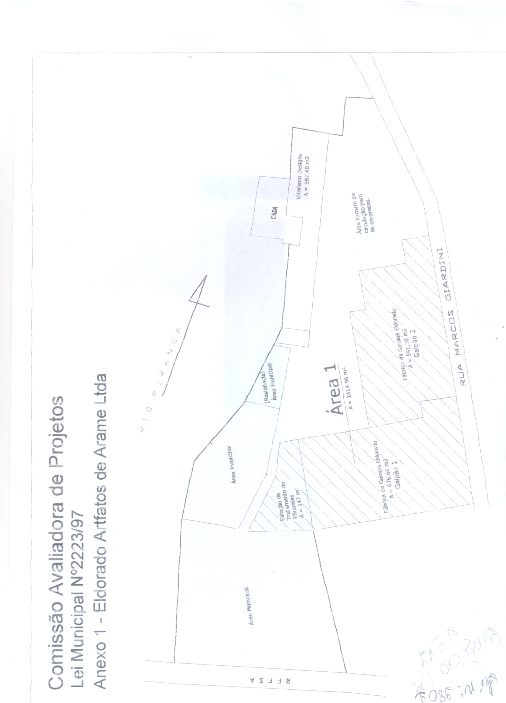 I - Área 1 com 1414 m², localizada no bairro Copacabana, conforme croqui (anexo 1), à Empresa Eldorado Artefatos de Arame Ltda, de propriedade do senhor Paulo Neves de Castro.